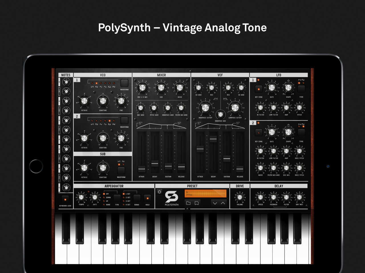 PolySynth is the first true polyphonic synthesizer from DesignByPaul. Packed with vintage analog character. Everything on one screen makes sound design quick and easy including fine tuning of each note in the scale for endless microtuning possibilities. PolySynth filter section sports a ms20 style resonant highpass and 24db/oct resonant lowpass. PolySynth has Audiobus 3 support, IAA (Inter-App Audio) and MIDI-In so you can connect, play and record with other many apps.